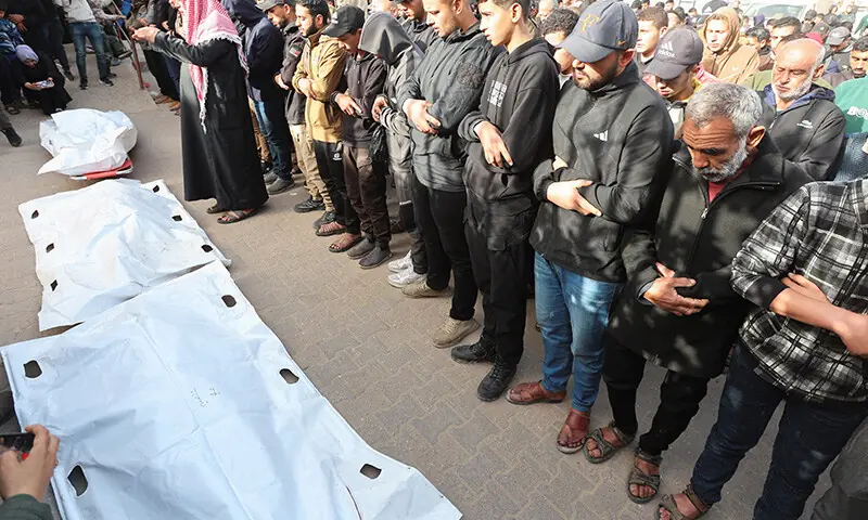 Dozens of relatives and mourners gathered at Nasser Hospital, where the bodies of some of those killed were laid out in white shrouds. Men and women stood in prayer ahead of the funeral, facing the corpses in the hospital compound.